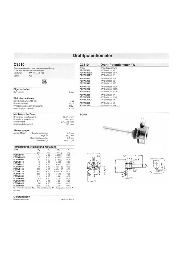 - PD5WE001 AB1, PD5WE004,7 AB5, PD5WE010 AB10, PD5WE022 AB25, PD5WE047 AB50, PD5WE100 AB100, PD5WE220 AB250, PD5WE470 AB500, PD5WK001 AB1K, PD5WK002,2 AB2,5K, PD5WK005 AB5K, PD5WK010 AB10K, PD5WK022 AB25K