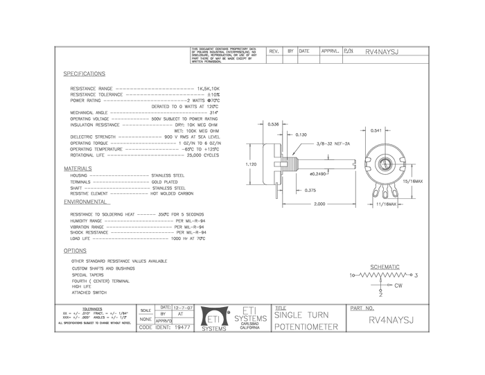 Potencjometr węglowy (hot molded carbon) jednoobrotowy linio wy; seria RV4; ośka 6,35mm długość liczona z gwintem 22 mm kąt pracy mechaniczny 314 stopni - mechaniczny stop Trwałość 25.000 cykli Rezystancja 10 kohm; Tolerancja rezystancji +-10%; zakres temperatur pracy -65 - 120 stopni moc 2 W / 70 stopni ; 0 W / 120 stopni Liniowość - nie podają