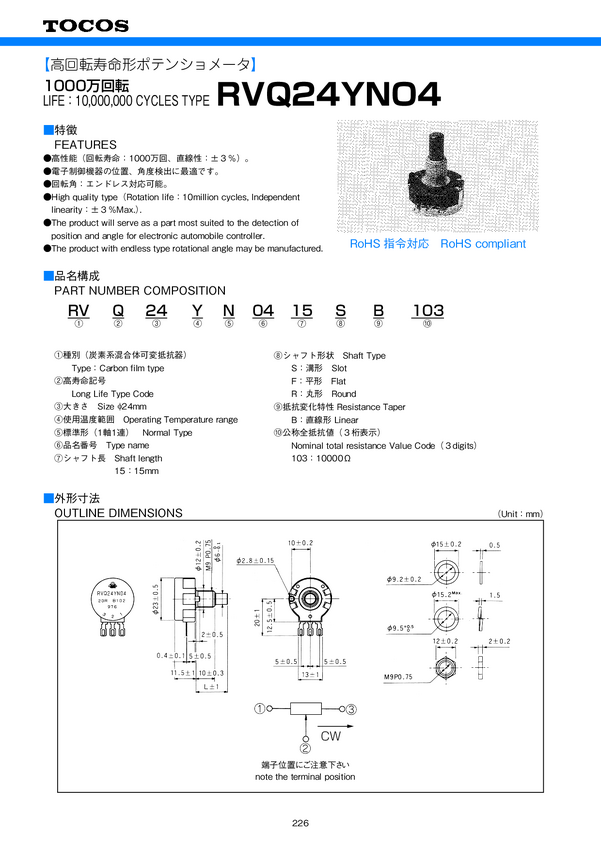 PM RVQ24YN04 TOCOS Potencjometr węglowy liniowy 24mm; bushing M9x0,75; P=0,25W; średnica 23,5m...
