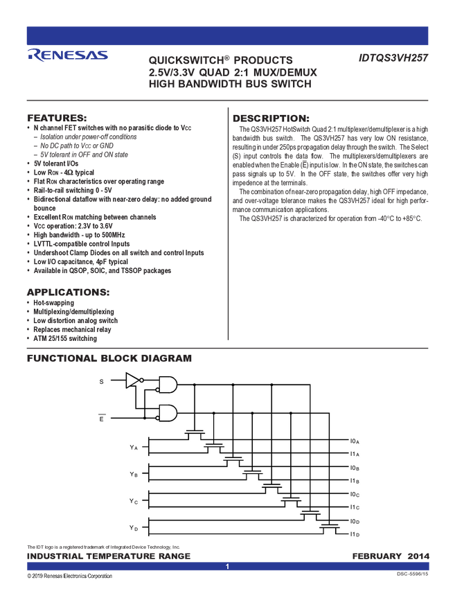 QS3VH257 3.3V Quad 2:1 Mux/Demux for Hot Swap Applications