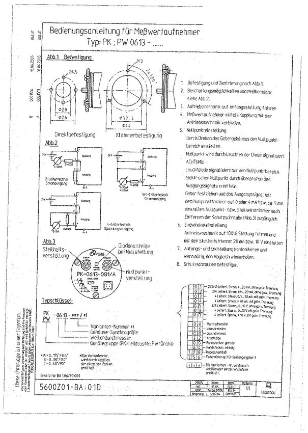 Precision plastic potentiometer in flange casing servo 13 kąt. mech. 360 st; output 4-20mA at max 600 ohm; kąt el. 240 st; shaft 6 mm/20mm; 4xM3/fi.26; 5600z01-129.004;kab. średnica 36,7 gł.61mm kołnierz 20/33,3mm; PK0613D-MU-129-A