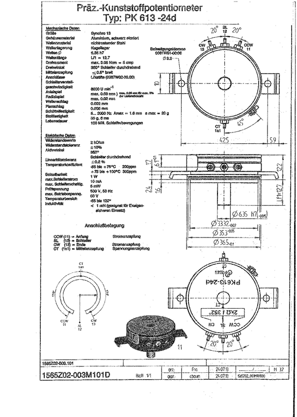 Servo Mount size 13 (33,32mm); 1W; tol. +-10%; lin 0,2%; resistance element SD, 2kohm +-10%; active angle 352 deg; me ch.360 deg; with CT; ośka 6,35 x 12,7 mm; śr 36,5;gł.13,7mm; 1565z02-003m101d / 1565Z02-003.101