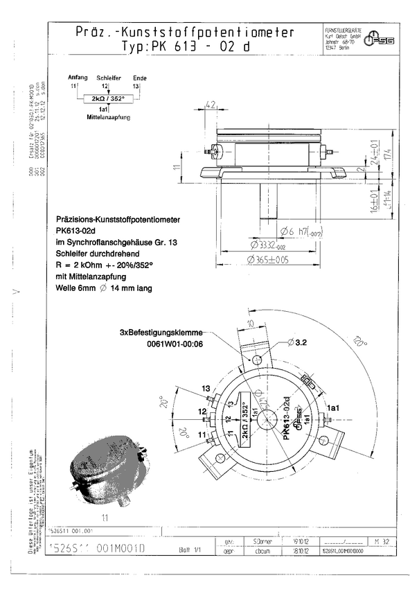 Precision plastic potentiometer in flange casing of servo 13 wiper ratatable without limit stops res.2k +-20%/352 deg CT Center Tap; shaft 6mm/ 14mm an1526s11-001.001 Podobny ale z ośką 6,35mm/12,7mm PK613-24D-CT-2K model z CT center tapem