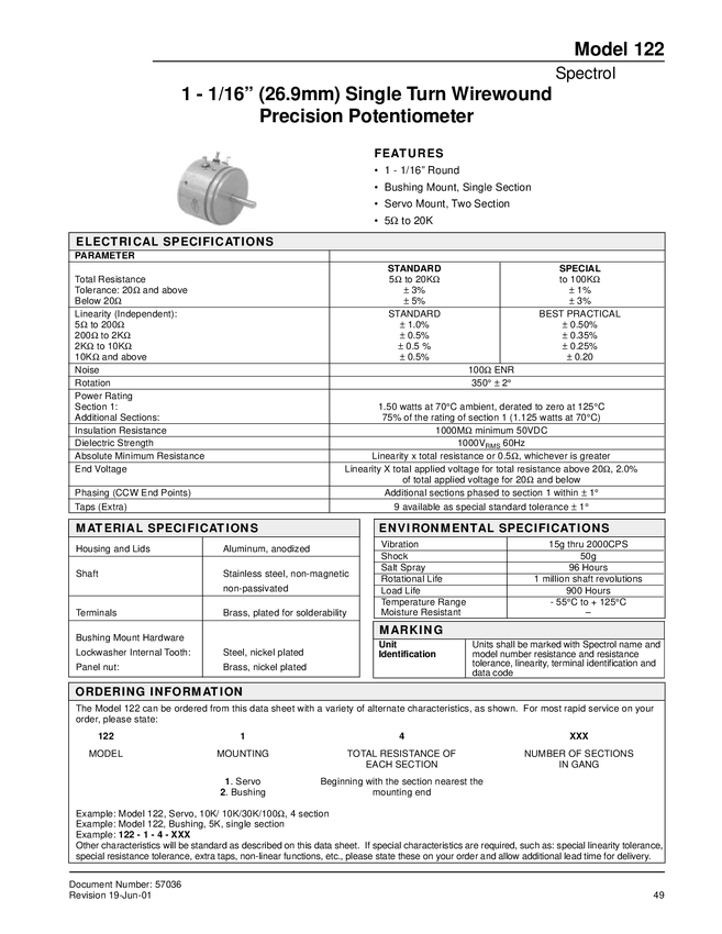 PM122-1-SPECTROL 1-1/16"=26,9mmm 1 obrotowy,drutowy Potencjometr drutowy, Servo; lin 1%, tol...