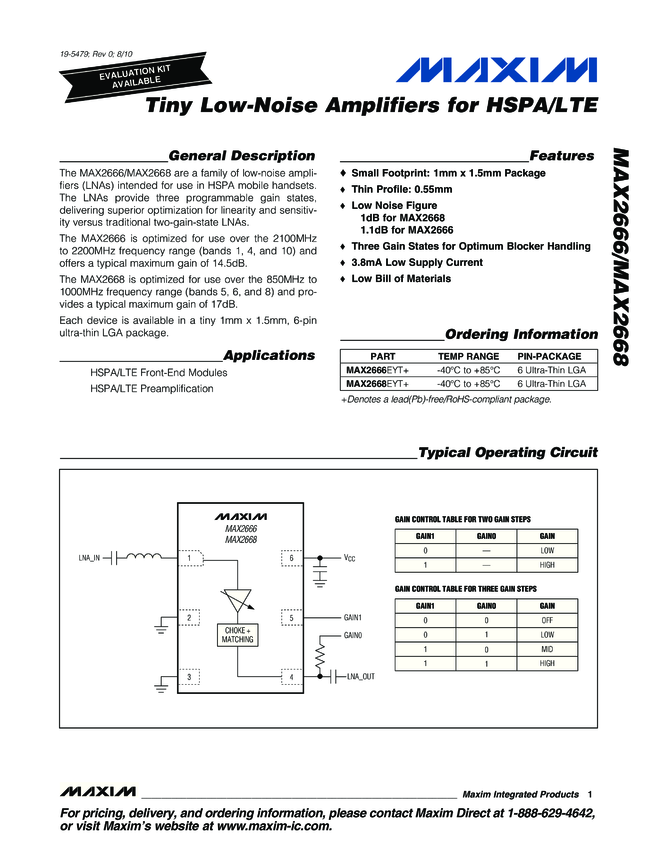 MAX2666, MAX2668 Tiny Low-Noise Amplifiers for HSPA/LTE