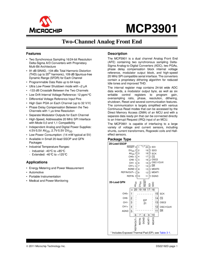 MCP3901 Data Sheet - Two Channel Analog Front End (04/12/2011)