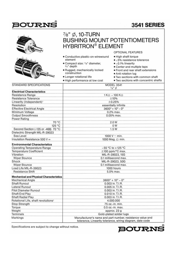 22MM, 10TURN, 1KOHM HYBRITRON Potencjometr Hybrid; Bushing; lin.=0,25%; tolerancja=10% 10 obrotowy; śr.7/8"= 22,23mm; Długość=19,05mm; ośka=1/4"=6,35m m, trwałość = 5.000.000 obr; moc=2W