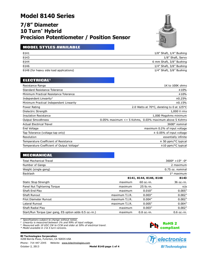 Potencjometr 10 cio obrotowy Hybrid, czyli drutowy pokryty przewodzącym plastikiem; średnica korpusu 7/8" =22,23 mm głębokość 19,01 mm; Bushing gwint 3/8-32UNEF; długość gwintu 7,93mm; ośka 6,35 mm długość ośki 20,62 mm liczone łącznie z gwinteml Rezystancja 2 kohm; +-10%; Liniowość +-0,25%; moc 2W; ką mechaniczny 3600 stopni +15-0 stopni ; Dodatkowo czawarta końcówka tzw. CT Center Tap; odczep w środku Do wyczerpania magazynu naszego lub naszego dostawcy widok jak na zdjęciach