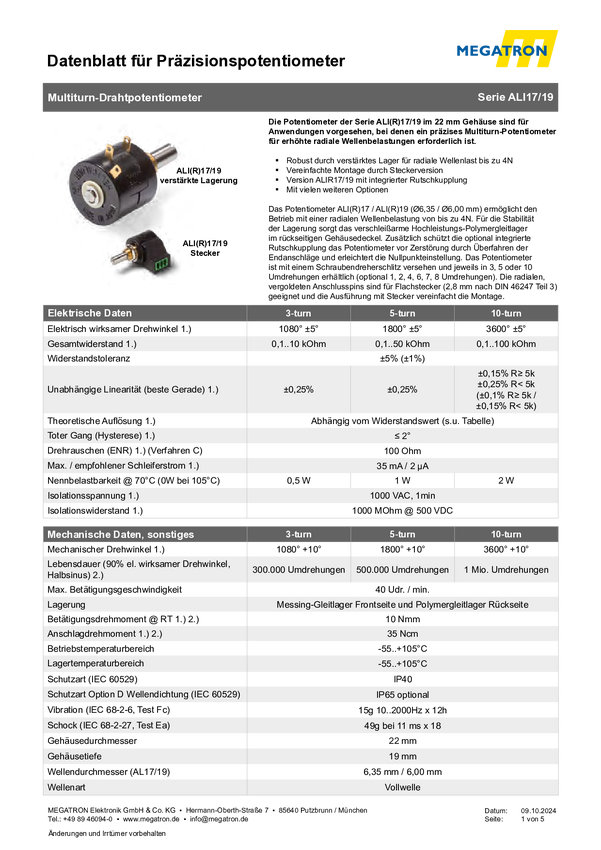 Potencjometr drutowy wieloobrotowy; Bushing 3/8-32UNEF; ośka 6,35 mm; długość ośki 20,6 mm lub dłuższa; średnica bębna 22,23mm gł. bębna 19 mm; Tolerancja rezystanc ji +-5% ale są wersje +-1%; liniowośc: +-0,25 % ale może być +- %; Trwałość dla 10 cio obrotowego AL1510/AL1610/AL1710/AL1910 = 22hp-10.. 22HPM-10.. - 1.000.000 cykli dla 5 obr. AL1505.. 500.000 cykli dla 3 obrotowego AL1503.. 300.000 cykli