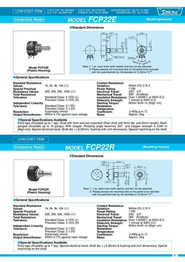 Potencjometr przewodzący plastik; Bushing tol 15%; lin 3%; na bazie modelu PMFCP22E.. nadruk SFCP22E; specjalny kąt 250 stopni; kąt mechaiczny 360 stopni; Rezystancja 10 kohm; moc. 1W