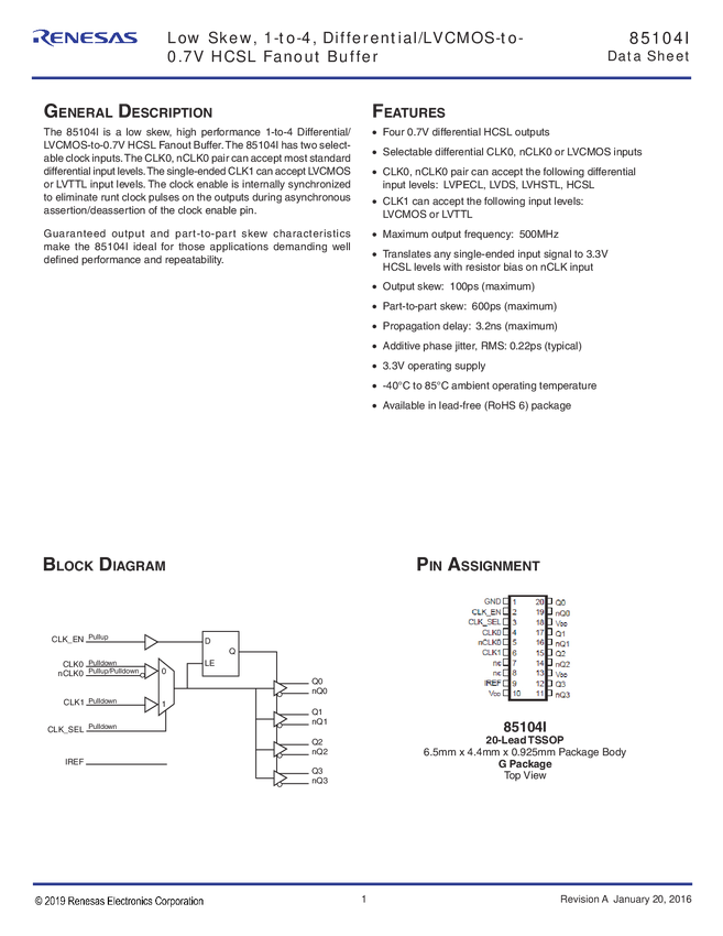 85104I Low Skew,1-to-4 Differential/LVCMOS-to-0.7V HCSL Fanout Buffer