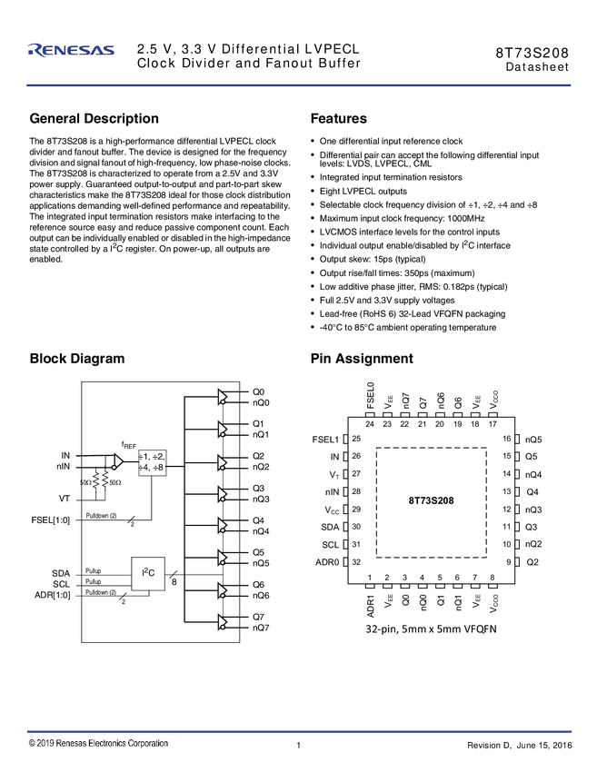 8T73S208 2.5V/3.3V Differential LVPECL Clock Divider And Fanout Buffer