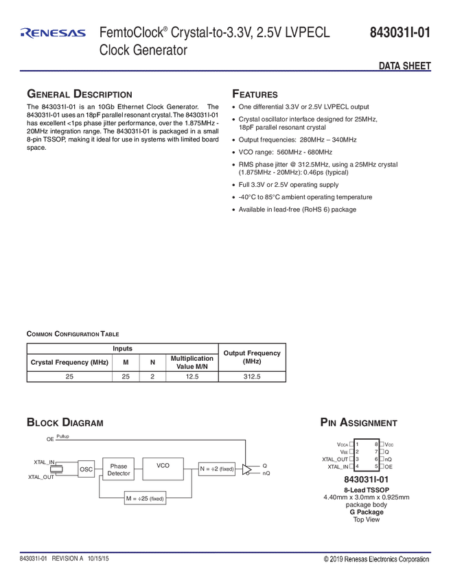 843031I-01 FemtoClock Crystal-to-3.3V,2.5V LVPECL Clock Generator