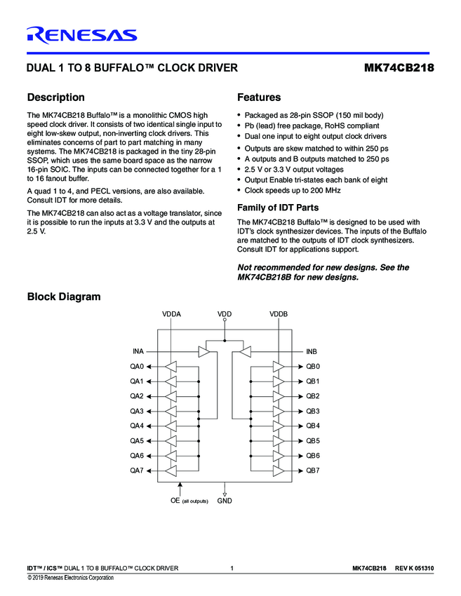 MK74CB218 Dual 1 to 8 Buffalo™ Clock Driver