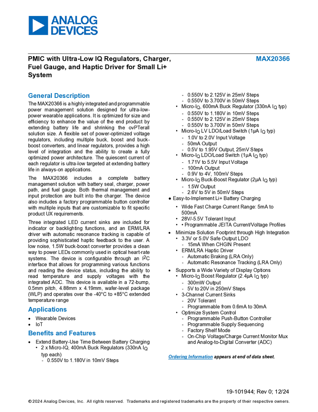 MAX20366 PMIC with Ultra-Low IQ Regulators, Charger, Fuel Gauge, and Haptic Driver f...