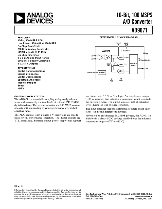AD9071 10-Bit, 100 MSPS, TTL A/D Converter