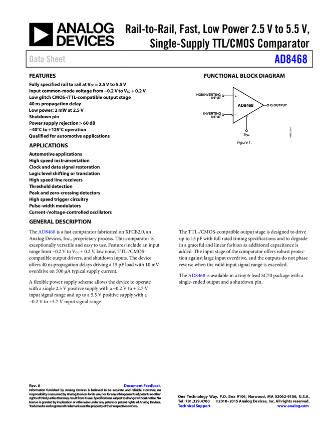 AD8468 Rail-to-Rail, Fast, Low Power 2.5 V to 5.5 V, Single-Supply TTL/CMOS Compar...