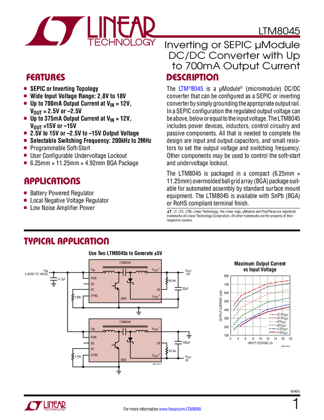 LTM8045 Inverting or SEPIC μModule (Power Module) DC/DC Converter with Up to 700mA...