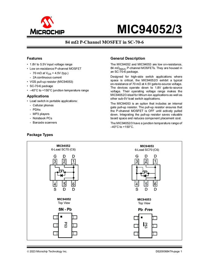 MIC94052 84 mΩ P-Channel MOSFET in SC-70-6