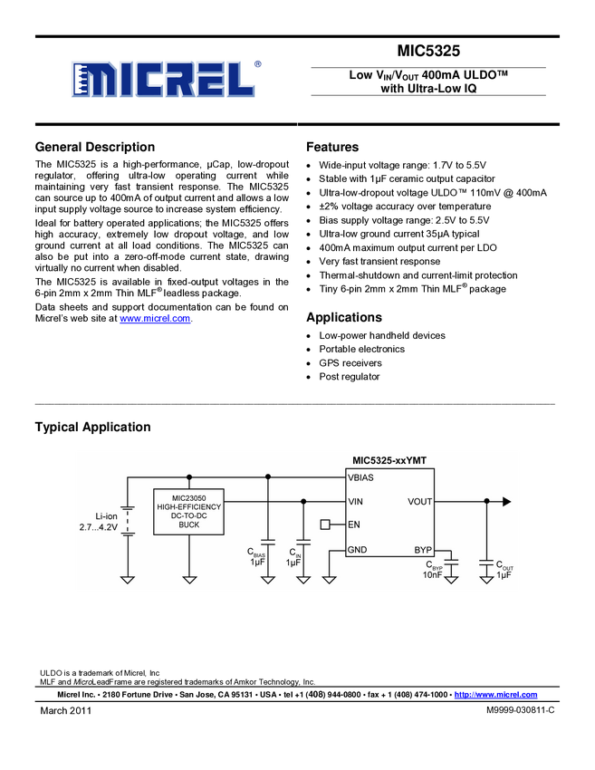 MIC5325 Low VIN/VOUT 400mA ULDO with Ultra-Low IQ