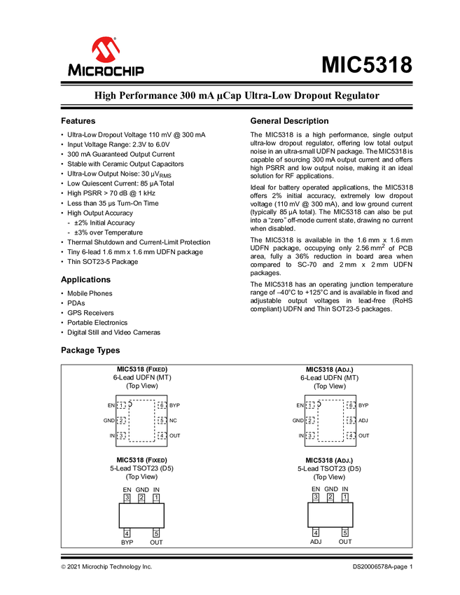MIC5318 High Performance 300mA μCap Ultra-Low Dropout Regulator