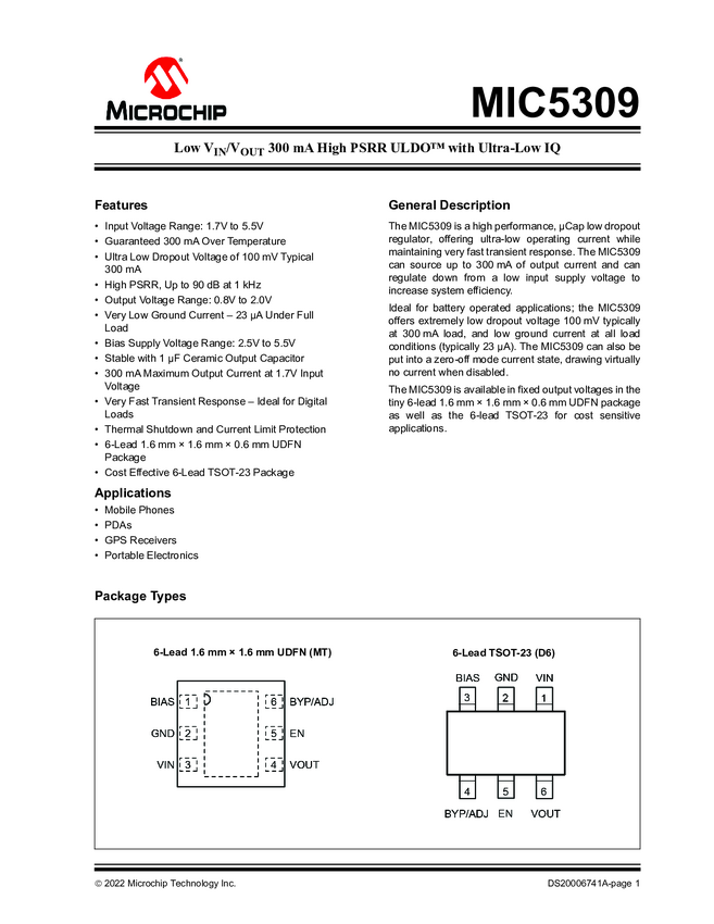 MIC5309 Low VIN/VOUT 300 mA High PSRR ULDO™ with Ultra-Low IQ