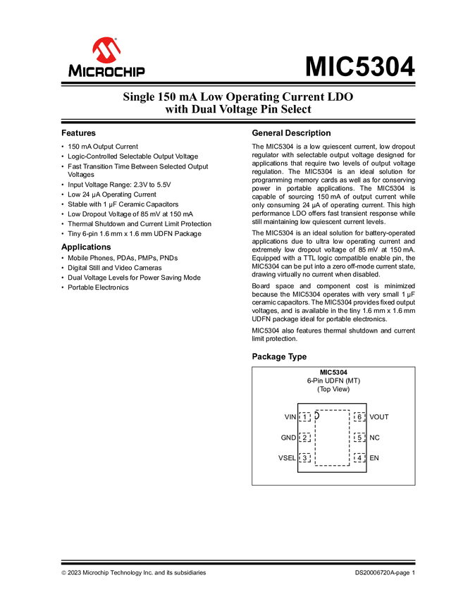 MIC5304 - Single 150 mA Low Operating Current LDO with Dual Voltage Pin Select