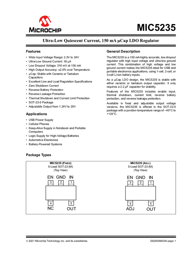 MIC5235 Ultra-Low Quiescent Current, 150mA μCap LDO Regulator