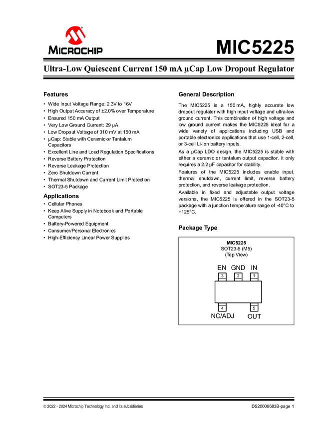 MIC5225 - Ultra-Low Quiescent Current 150mA µCap Low Dropout Regulator