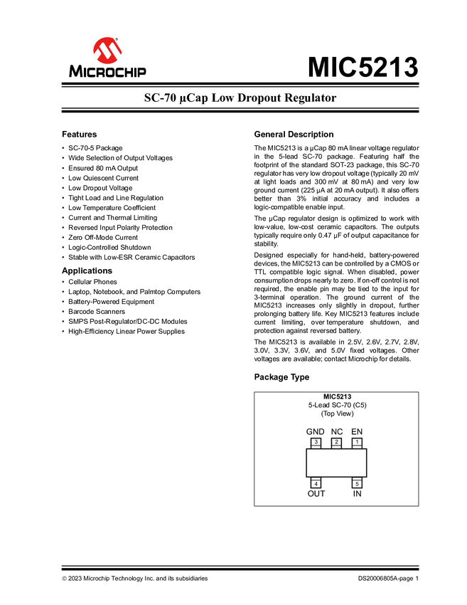 MIC5213 - SC-70 μCap Low Dropout Regulator