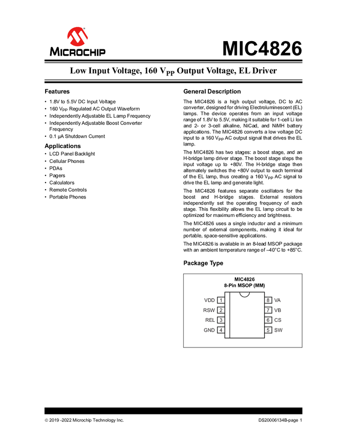 MIC4826 Low Input Voltage, 160 VPP Output Voltage, EL Driver