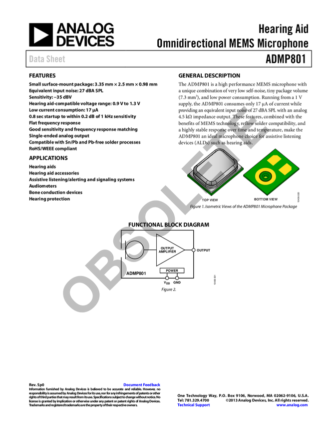 ADMP801 Hearing Aid Omnidirectional MEMS Microphone