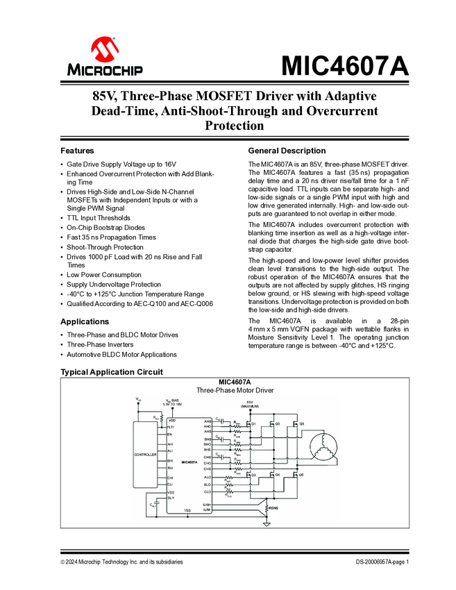 MIC4607A - 85V, Three-phase MOSFET Driver with Adaptive Dead-time, Anti-shoot-through and Overcurrent Protection
