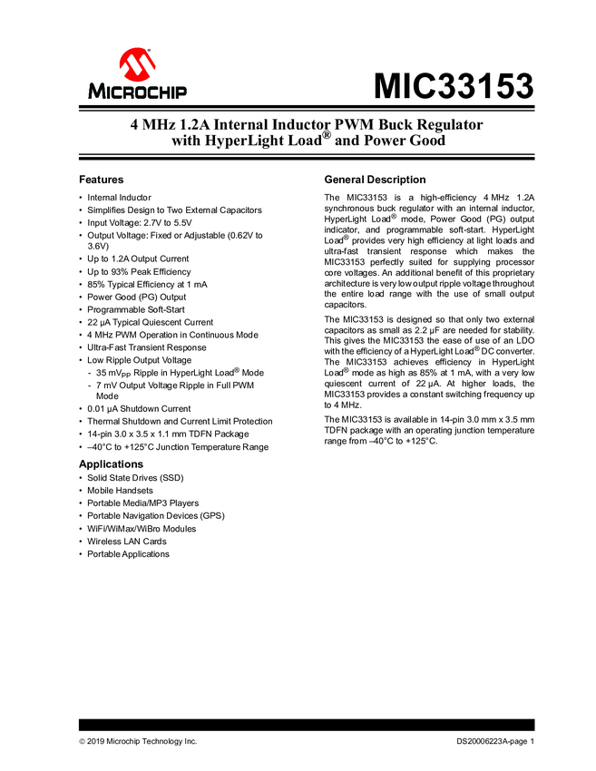 MIC33153 4MHz PWM 1.2A Internal Inductor Buck Regulator with HyperLight Load