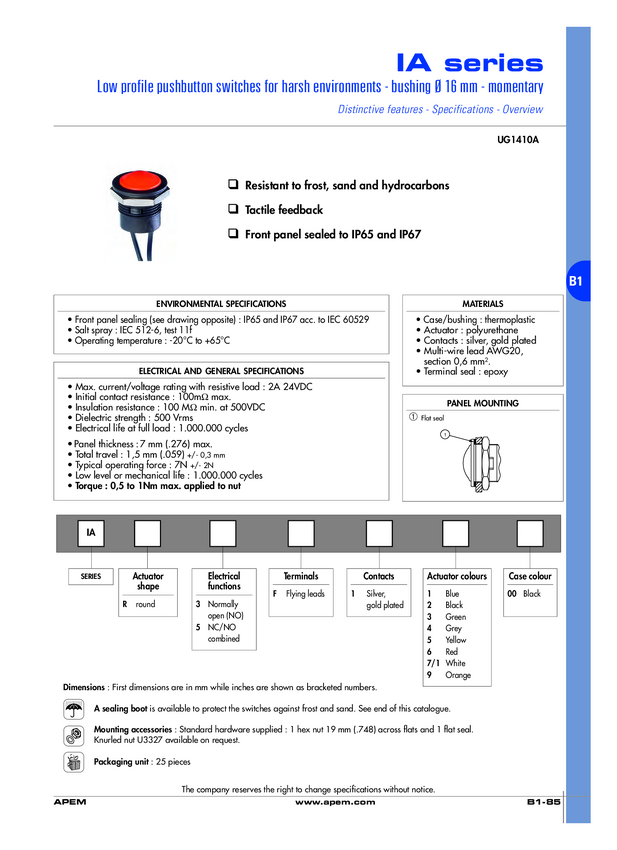 Przycisk szary do joysticków IP65 chwilowy SPST NO Normally open średnica wycięcia 16 mm / 16,2 mm 2A 24V DC 2 kabelki grubość panelu 7 mm max Total travel 1,5mm Trwałość 1.000.000 cykli Panel cu-out fi 16,2mm Min. pitch for matrix mounting with standard nut 27x27 mm with kunrled nut 20x20 ( Nakrętka Radekowana M16 plus NAKRĘTKA_RADEŁKOWANA M16 sprzedawana oddzielnie