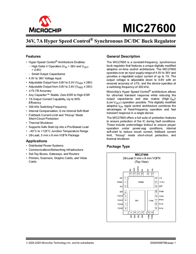 MIC27600 36V, 7A Hyper Speed Control® Synchronous DC/DC Buck Regulator