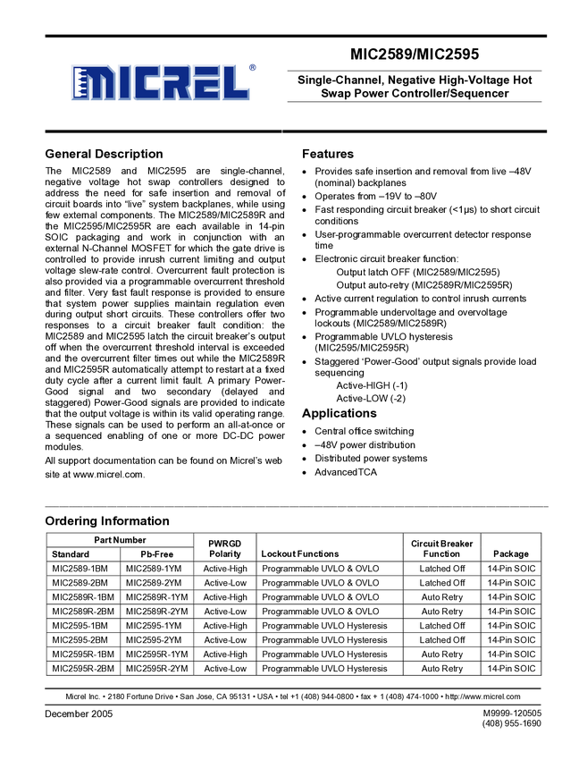 MIC2589/MIC2595-Single-Channel, Negative High-Voltage Hot Swap Power Cont/Seq