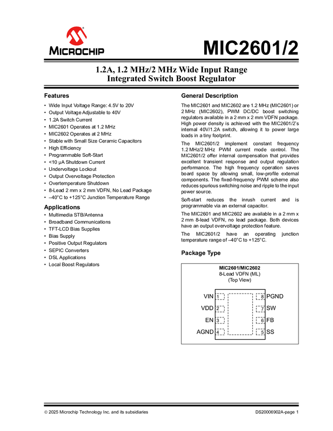 MIC2601 MIC2601/2 - 1.2A, 1.2MHz/2MHz Wide Input Range Integrated Switch Boost Regu...