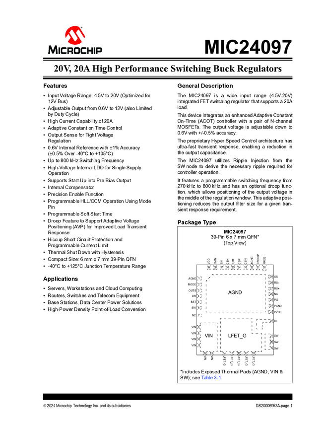 MIC24097 - 20V, 20A High Performance Switching Buck Regulators
