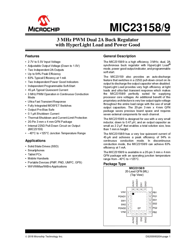 MIC23159 MIC23158/9 - 3MHz PWM Dual 2A Buck Regulator with HyperLight Load® & Power...