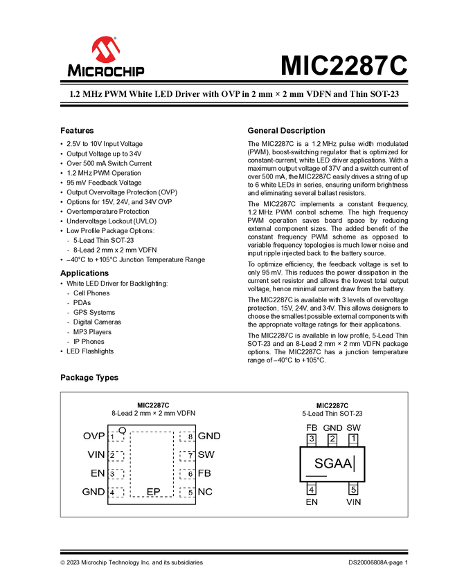 MIC2287C 1.2MHz PWM White LED Driver with OVP in 2mm × 2mm VDFN and Thin SOT-23 Regu...