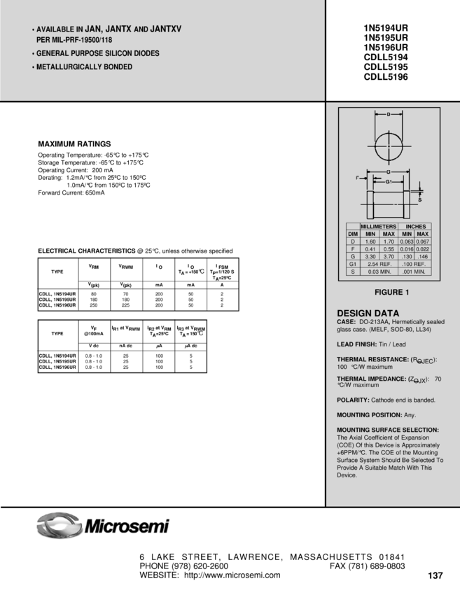 JAN1N5194URDUP, JANTX1N5194URDUP, JANTXV1N5194URDUP, JANTX1N5195URDUP, JANTXV1N5195URDUP, JAN1N5196URDUP, JANTX1N5196URDUP, JANTXV1N5196URDUP, CDLL5194, CDLL5195, CDLL5196
