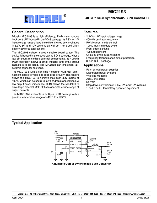 MIC2193 - 400kHz SO-8 Synchronous Buck Control IC
