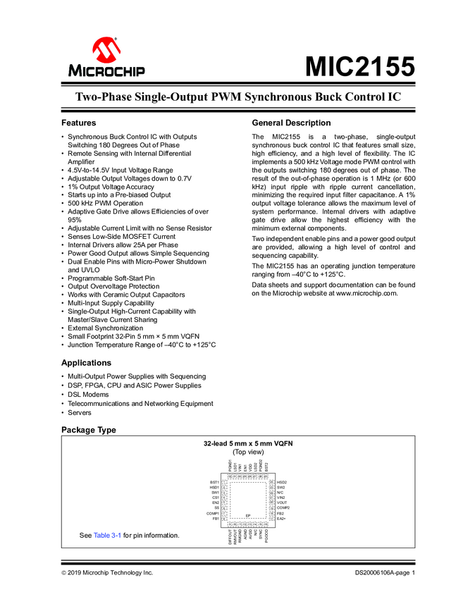MIC2155 Two-Phase Single-Output PWM Synchronous Buck Control IC Data Sheet