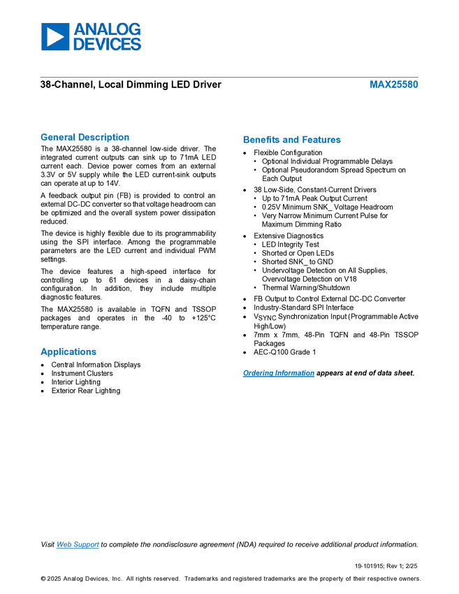MAX25580 38-Channel, Local Dimming LED Driver