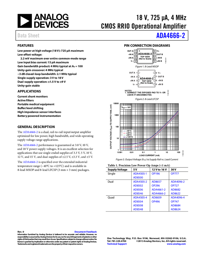 ADA4666-2 18 V, 725 µA, 4 MHz CMOS RRIO Operational Amplifier