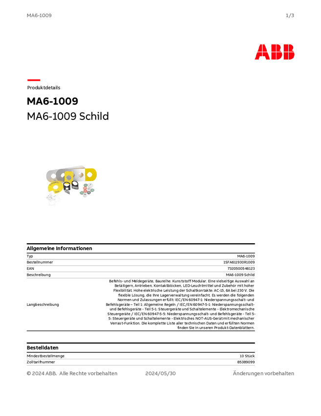 1SFA611930R1009 Płytka do etykietowania ABB MA6-1009 (S x W) 186 mm x 1 mm 1 szt.