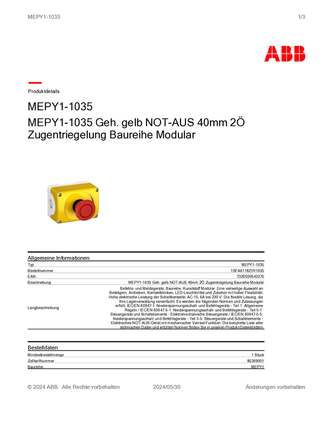 1SFA611821R1035 ABB 1SFA611821R1035 MEPY1-1035 Przycisk zatrzymania awaryjnego 1 szt.