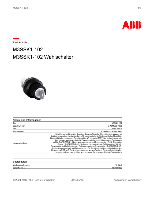 1SFA611283R1002 ABB 1SFA611283R1002 M3SSK1-102 Przełącznik kluczykowy klucz 1 szt.