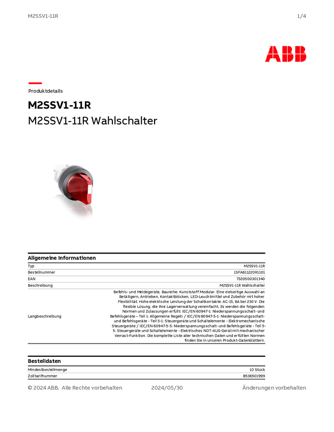 1SFA611220R1101 ABB 1SFA611220R1101 M2SSV1-11R Podświetlany przełącznik wybierakowy przełąc...